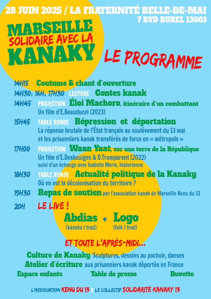 Le 28 juin, rendez-vous dès 14h à la Fraternité-Belle de mai (7 bvd Burel, Marseille 3e) pour une grande journée à la fois politique et culturelle pour faire entendre notre soutien à la lutte d’indépendance du peuple kanak !
